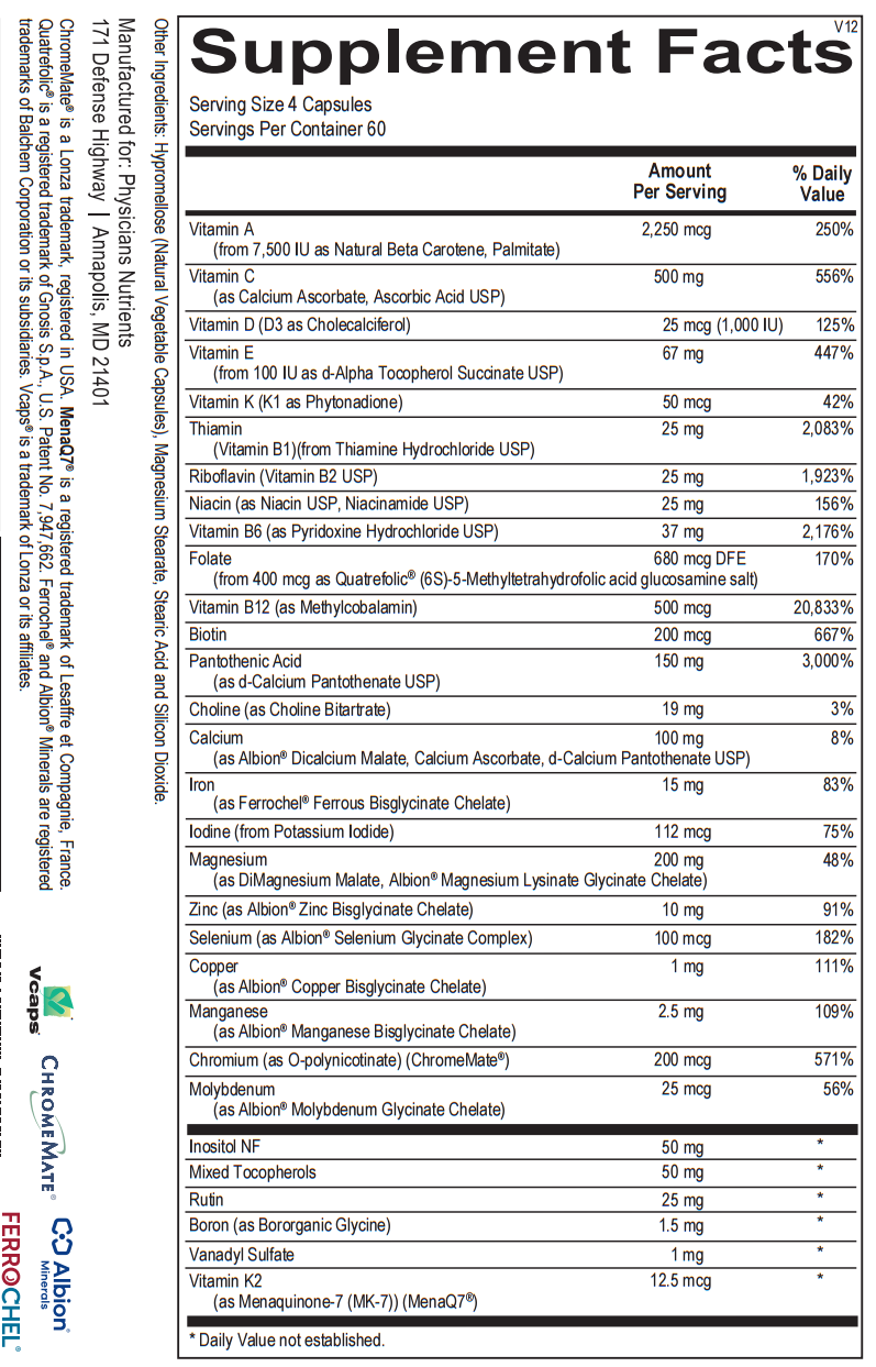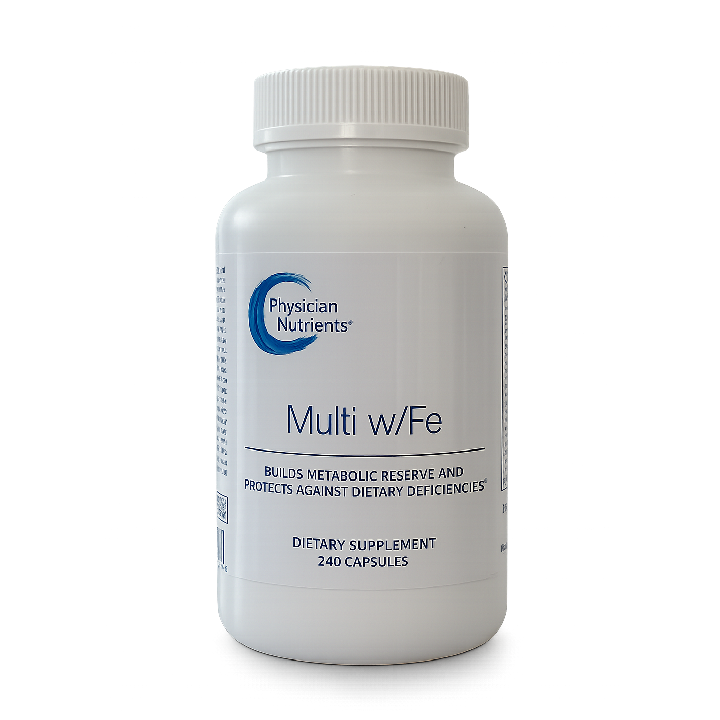 Multi W/FE is a comprehensive, hypo-allergenic multivitamin and mineral blend. As a complete multivitamin, Multi w/FE provides high-quality nutrients to build a healthy micronutrient reserve. USP* B vitamins support energy production and folate (as Quatrefolic™ - 100% 5-MTHF), the biologically active form of folic acid, improves methylation. Albion® TRAACS® chelated mineral complexes enhance bioavailability. Multi w/FE includes an optimal 2:1 magnesium to calcium ratio. Key antioxidant vitamin C, natural vitamin E, mixed tocopherols and carotenoids protect cells from free radical damage. Multi w/FE also contains the synergistic blend of vitamin K2 (as MK-7) and D3 which are critical for supporting bone strength and cardiovascular health.